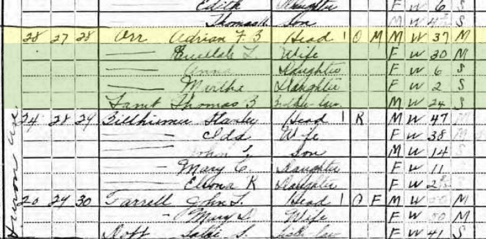 Beulah Lamb was in Pennsylvania about two years later, as she was married to Adrian Van Bracklin Orr and had her first child, Ann Ward Orr, on November 19, 1913. I checked the 1920 U.S. Census for Delaware County, PA and found the Orr family living at 28 Huron Avenue, Norwood, PA. The census showed Adrian and Beulah, along with two daughters, Anna and Martha. Also in the household was Beulah's youngest brother, Thomas B. Lamb. His occupation was listed as "pipe-fitting" and the industry as "shipbuilding." Adrian Orr's occupation was listed as "physician" and the industry as "syard" meaning shipyard.