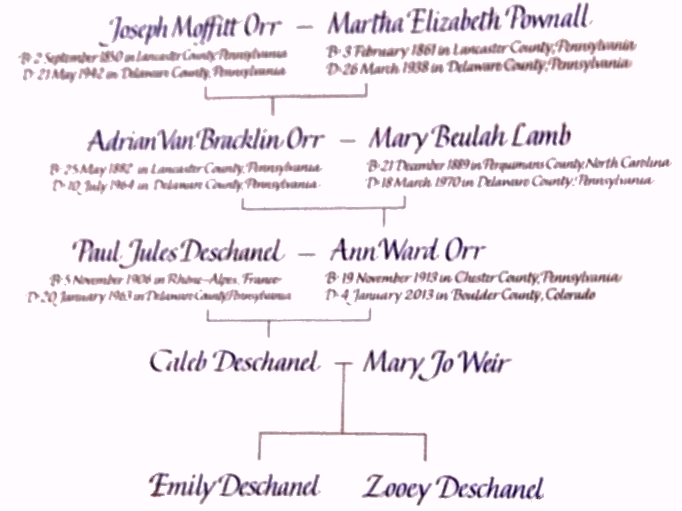 At the beginning of the episode, Zooey says of her grandmother, Ann Ward Orr, that "She comes from a Quaker family." Then she is shown her family tree. Here is an edited screen capture of that family tree chart.