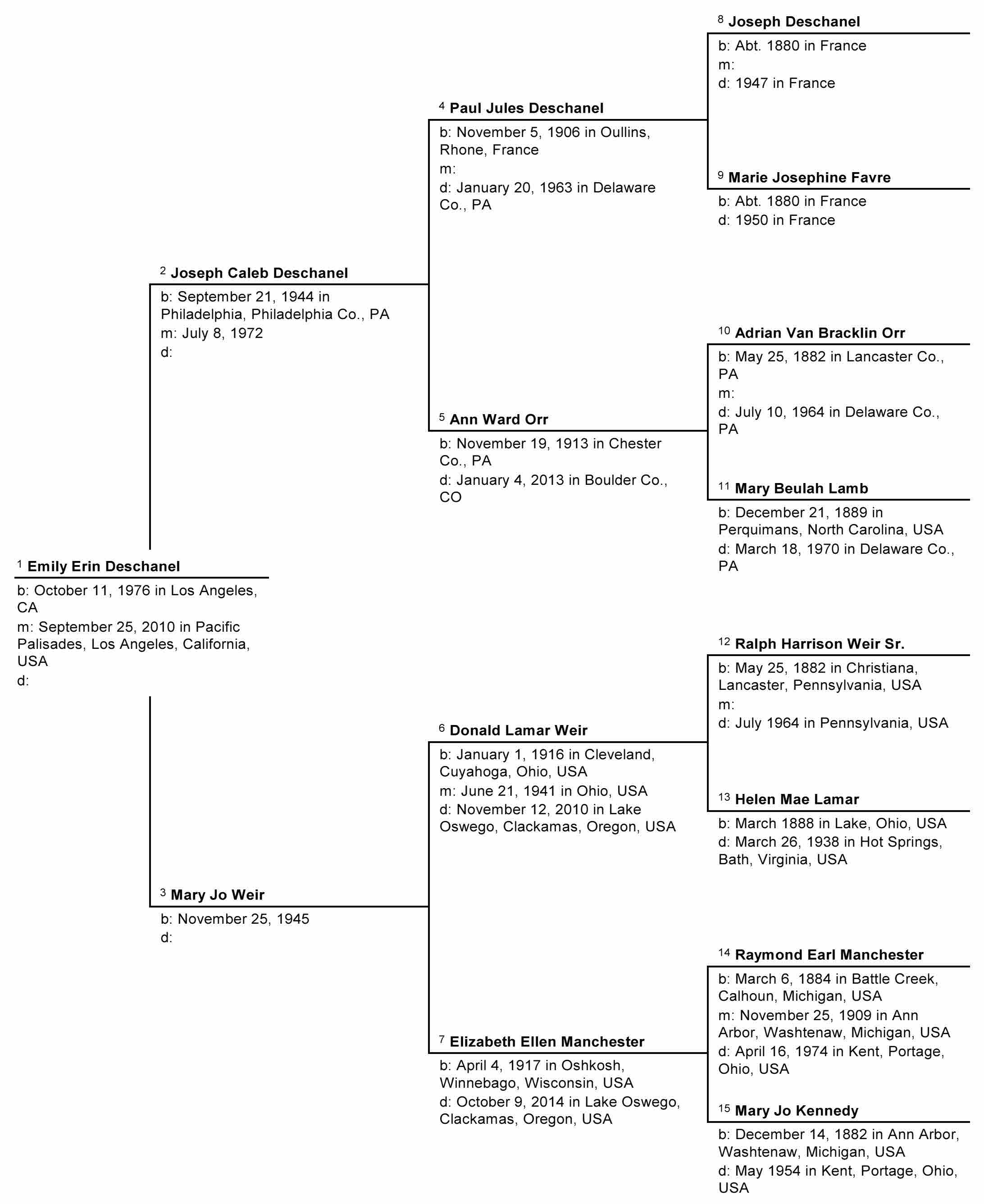 First, I added Emily and Zooey Deschanel's other ancestors to Family Tree Maker. Here is a chart showing Emily and her ancestry back to her great-grandparents.
