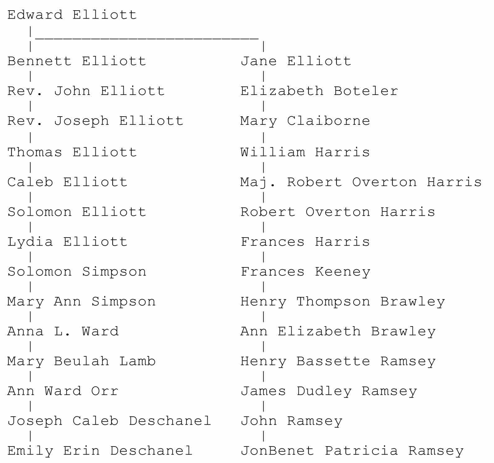 I was reading on the internet the day I started writing this article and came across article about the JonBenet Ramsey case. She was the child beauty queen who was murdered in her house in 1996. On a whim, I decided to trace her ancestry. It was difficult at first, because her father was a preacher and moved around a lot. Her parents were born too recently for there to be any good records online. I finally found a family tree on Ancestry.com that showed her grandfather, James Dudley Ramsey. Once I had that information, I was able to trace the family many generations back. I noticed that one of the lines went to Mary Claiborne, daughter of William Claiborne and Elizabeth Boteler. I remembered that my ancestry went back to those same two people. So I made a chart showing how I was related to JonBenet Ramsey. Then I remembered that it was through William Claiborne that I was descended from the Elliotts and related to Emily Deschanel. Therefore Emily Deschanel and JonBenet Ramsey are 13th cousins. Here is a chart showing that relationship.