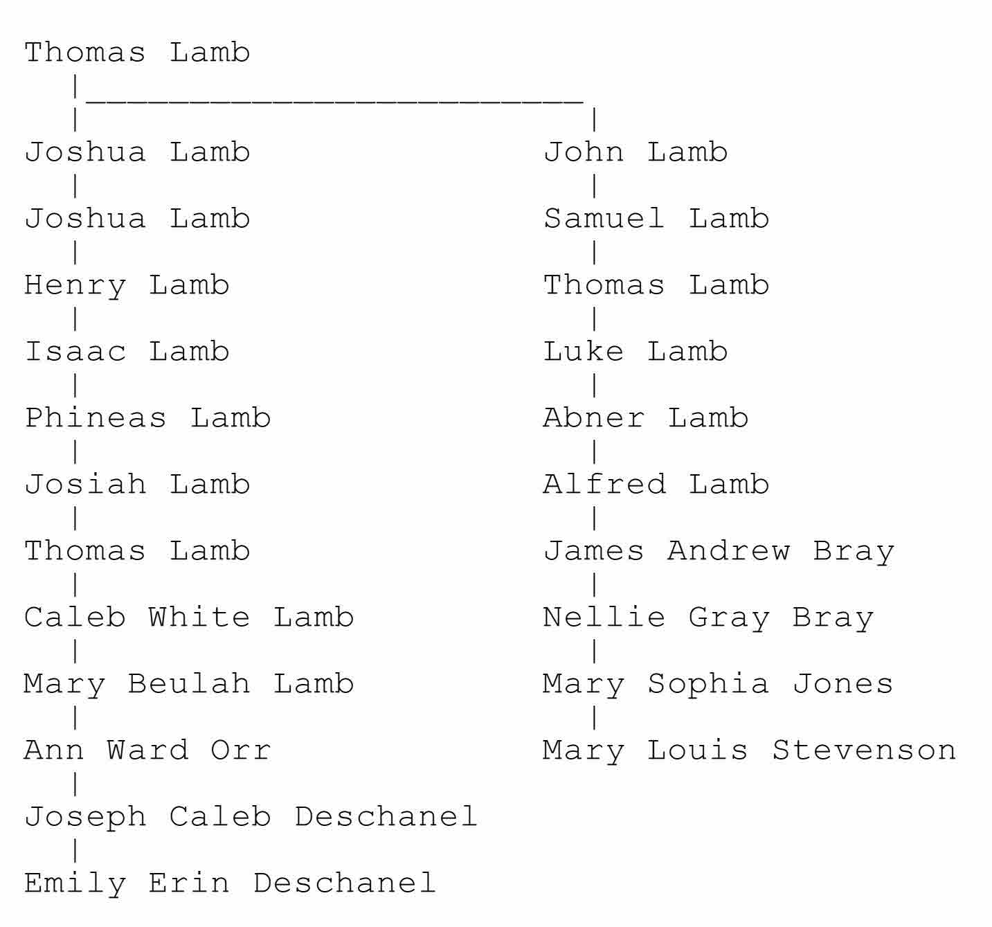 The next thing I did was tracing the connection between Erin Deschanel and my wife's great-great-grandfather, Alfred Lamb. Here is a chart outlining that connection.