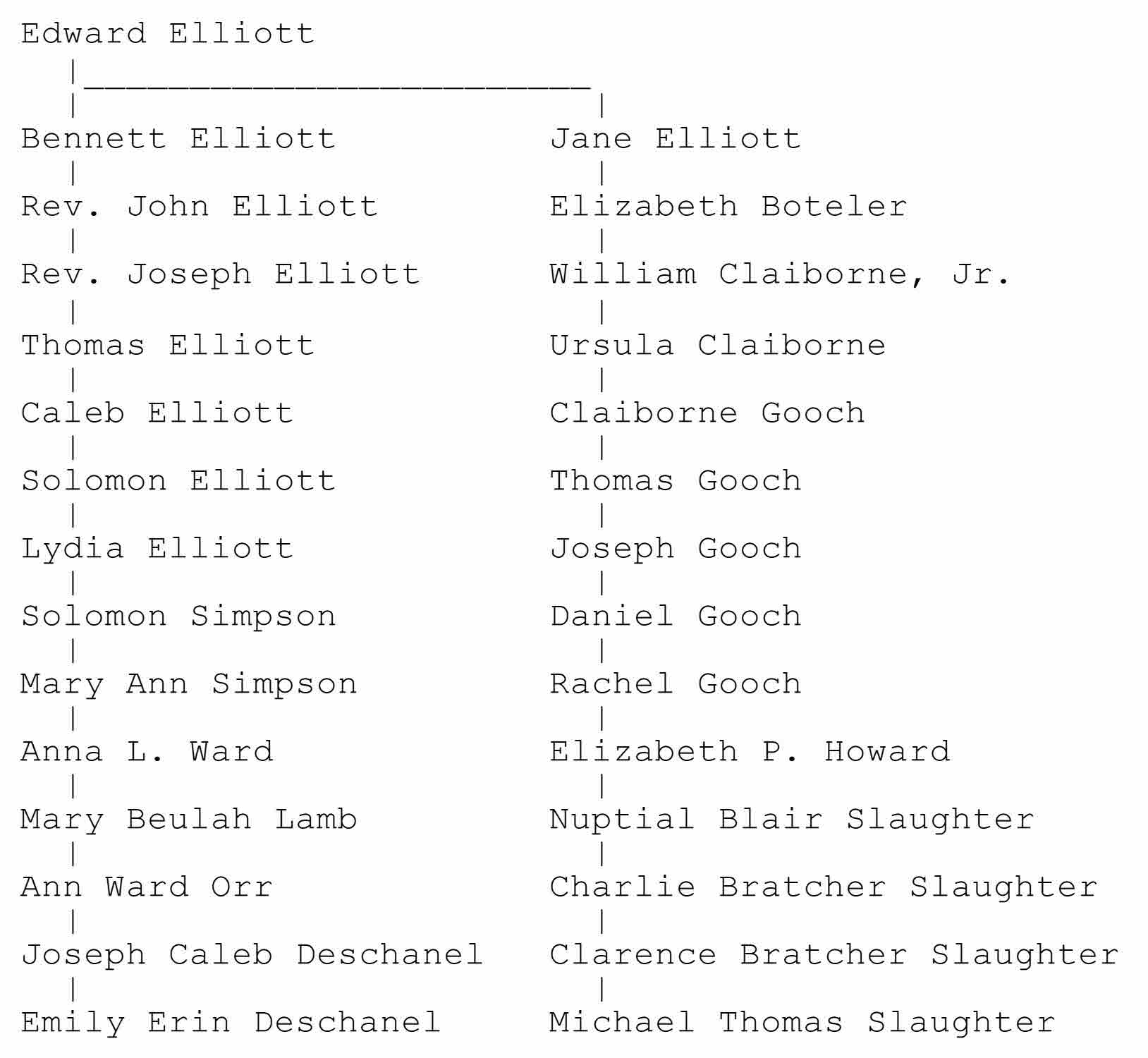 When I got back to Lydia Elliott and her parents, Solomon Elliott and Miriam Winslow, I found that Solomon and Miriam were already in my genealogy file. The Elliotts turned out to be connected to Elliotts in my own ancestry. Here is a chart showing how I am related to Emily Deschanel.