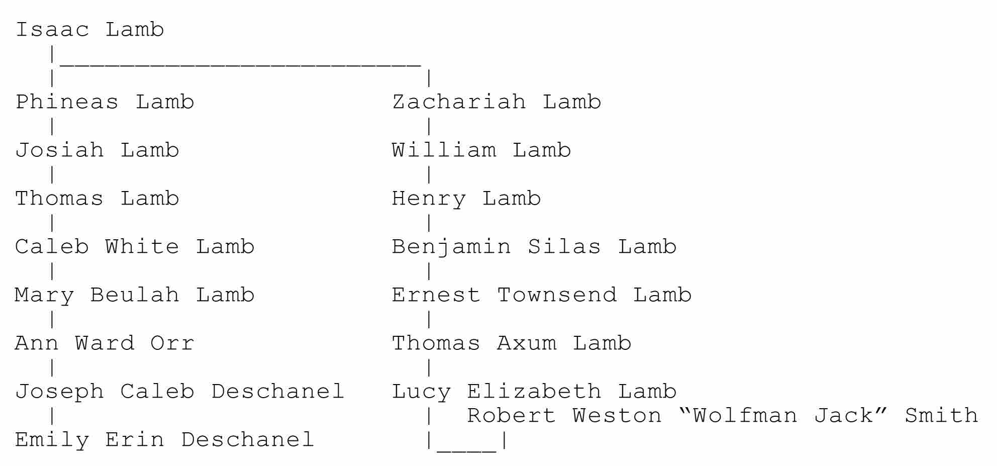 This shows that Emily Deschanel is Wolfman Jack's wife's 6th cousin, once removed.
