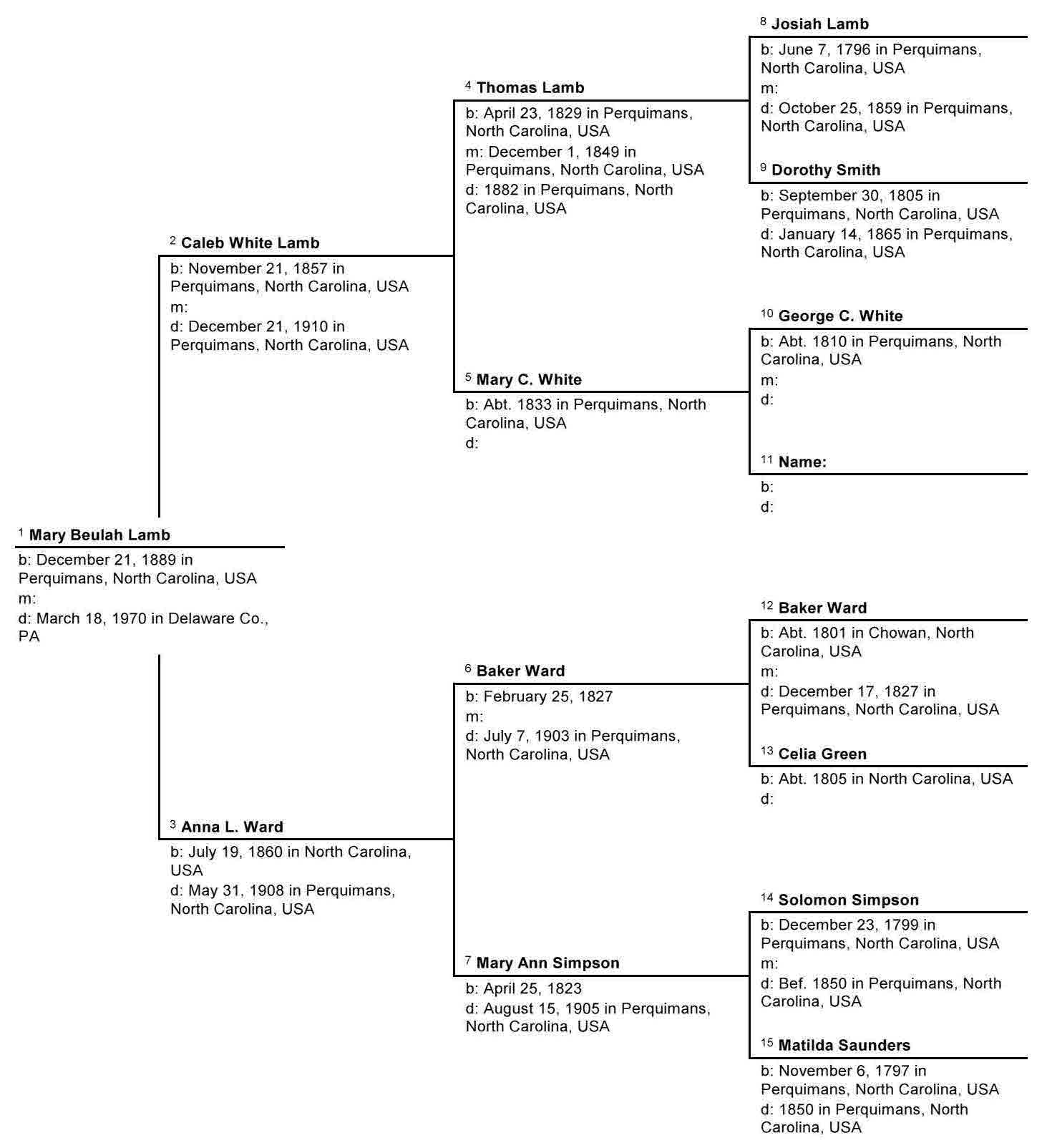 As I traced Beulah Lamb's ancestry further back in Perquimans County, I found that she was related to many of the oldest families in the area. She has thousands of cousins in northeastern North Carolina. Here are some of the family names: Lamb, White, Ward, Simpson, Saunders, Barrow, Bundy, Elliott, Winslow, and Rogerson.